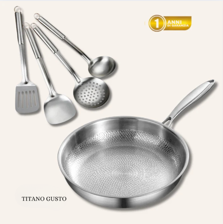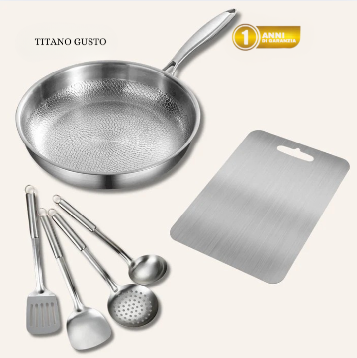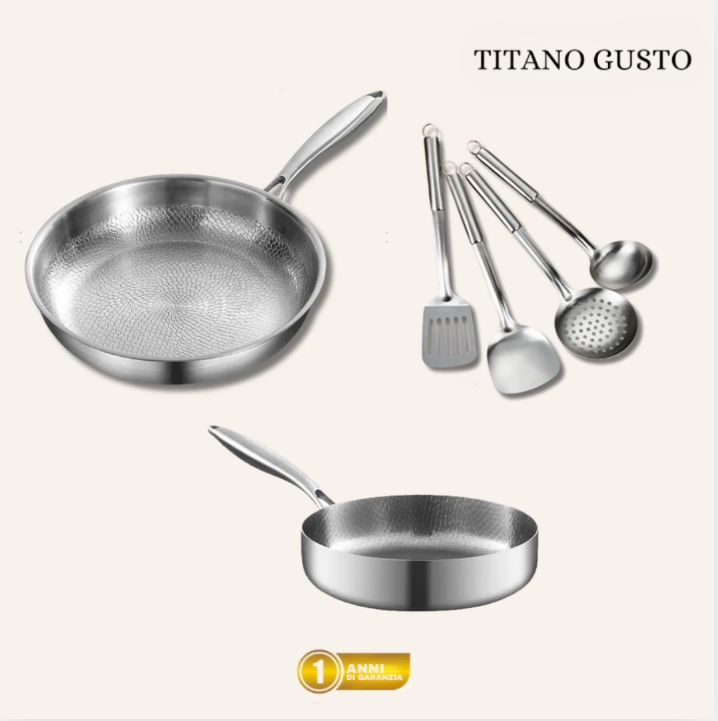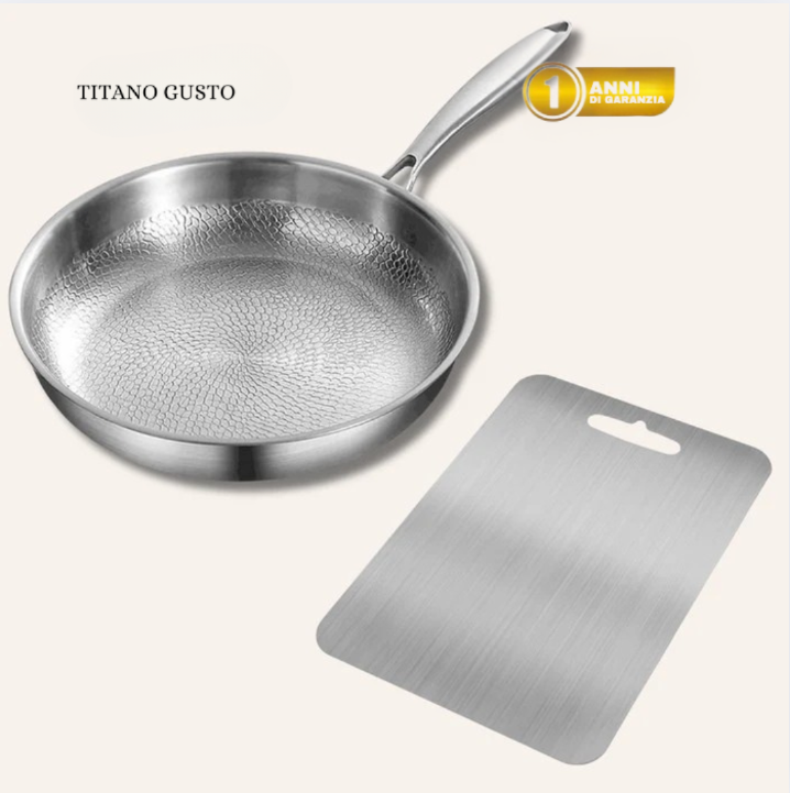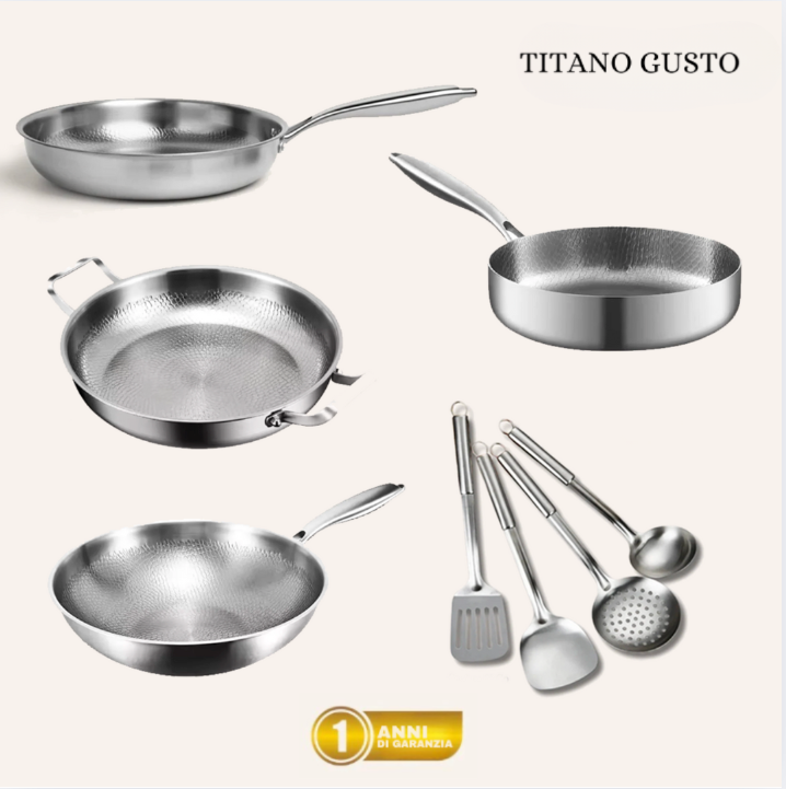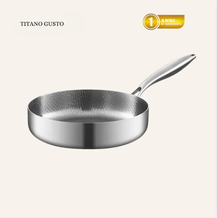 Titano Gusto. È pensato per chi apprezza la vera maestria artigianale più delle mode passeggere. Ogni padella è forgiata in titanio puro, progettata per durare, proteggere e funzionare alla perfezione. Non per una stagione, ma per tutta la vita.